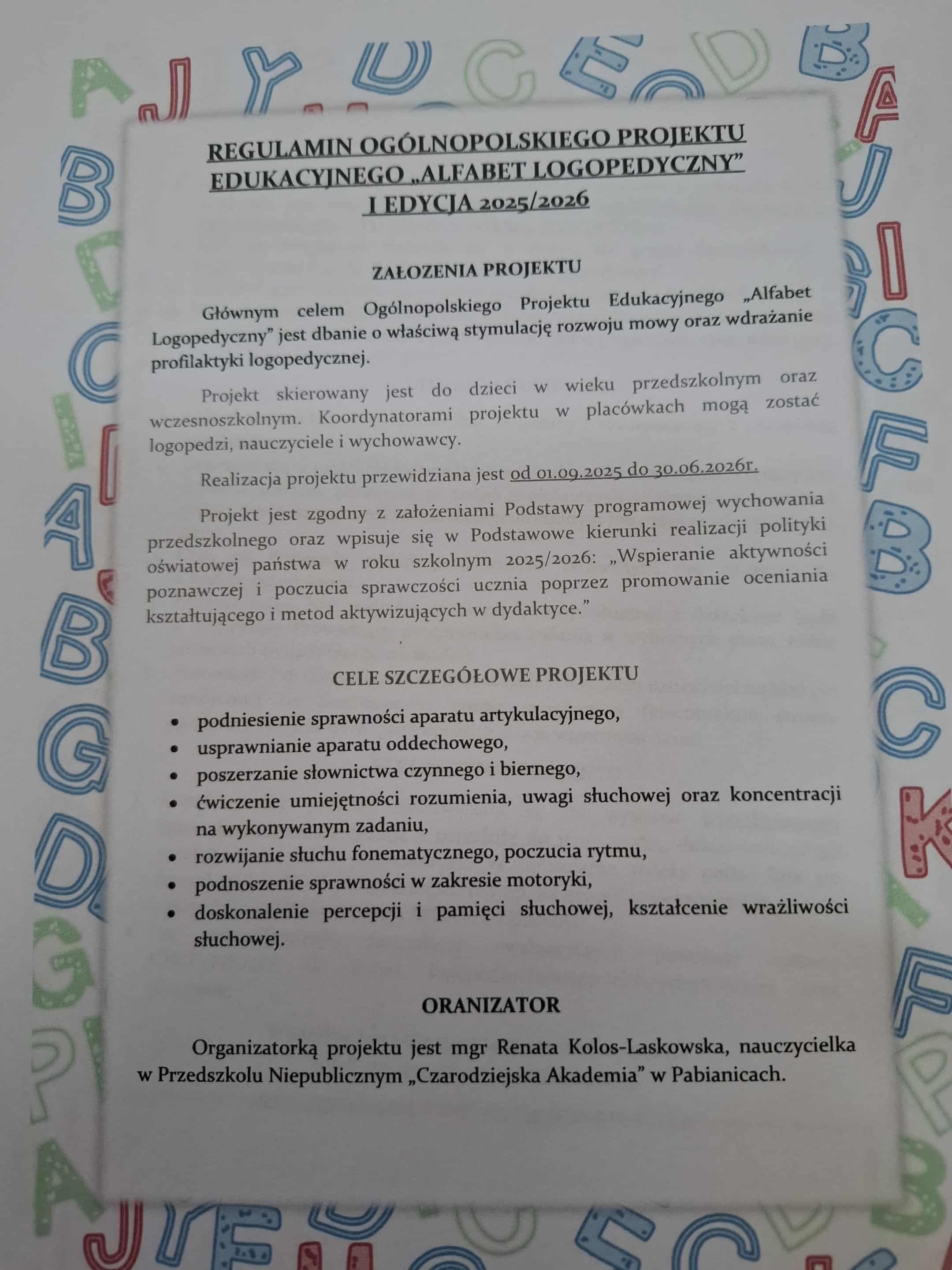 OGÓLNOPOLSKI PROJEKT EDUKACYJNY ,, ALFABET LOGOPEDYCZNY"