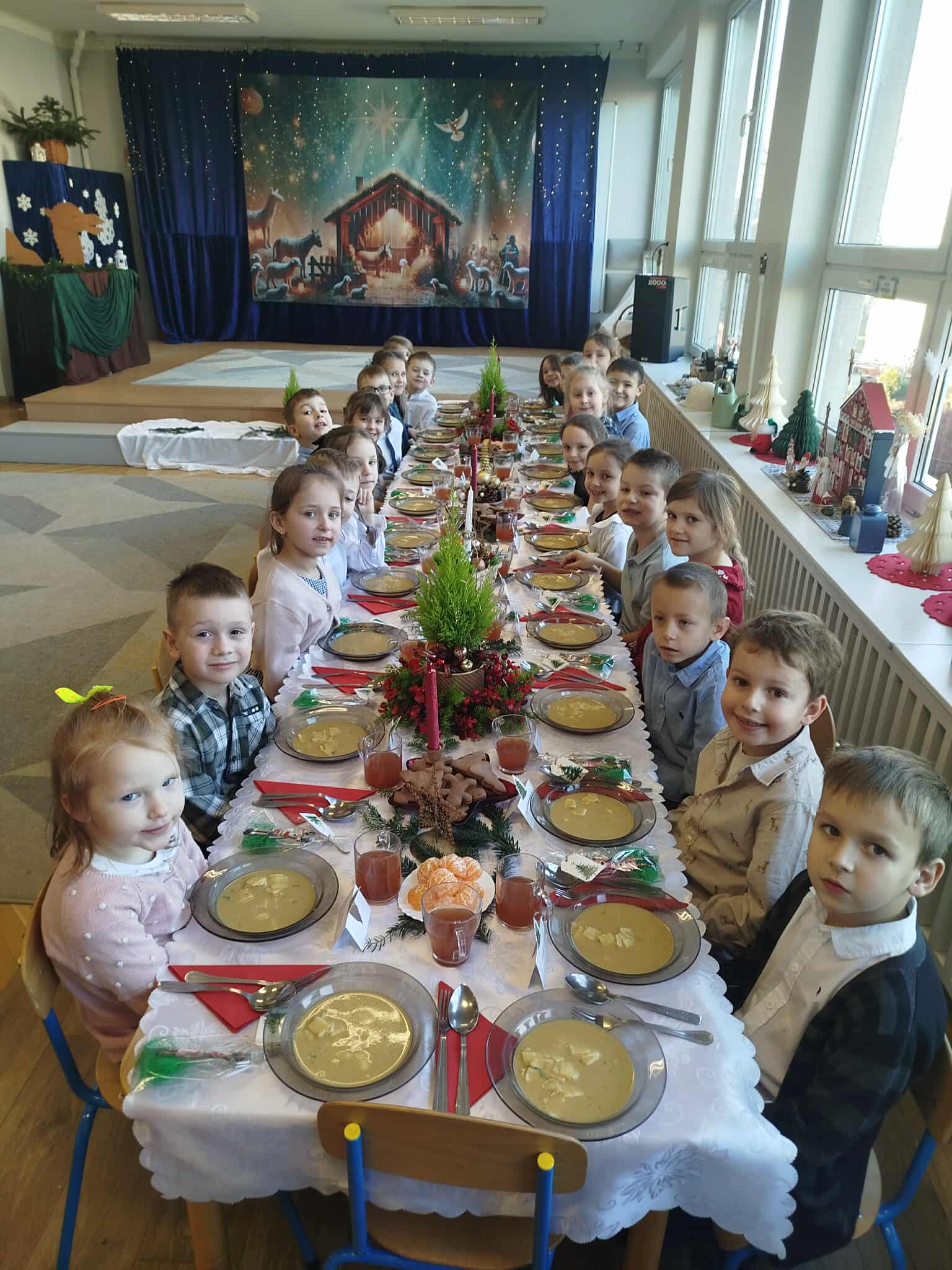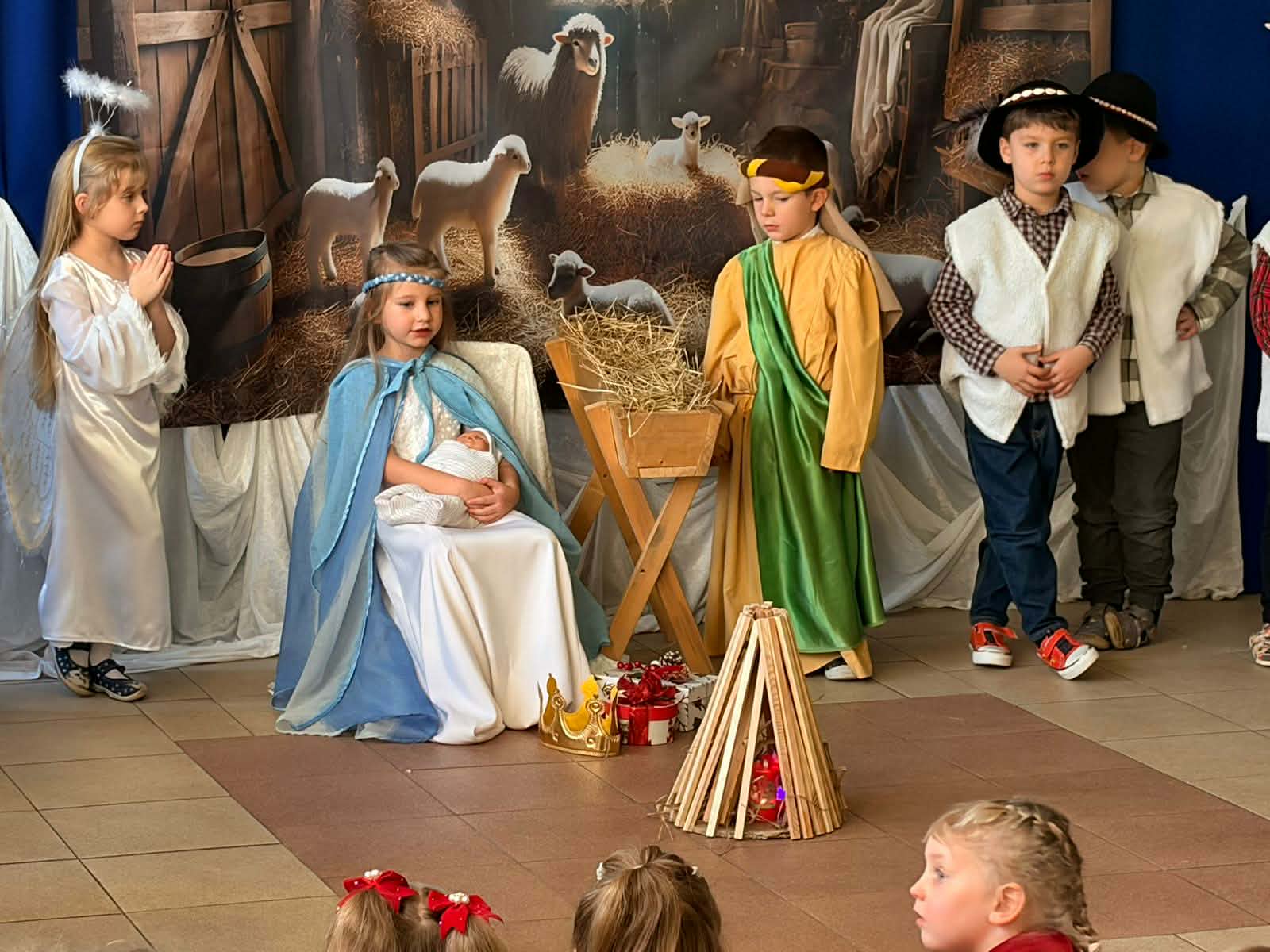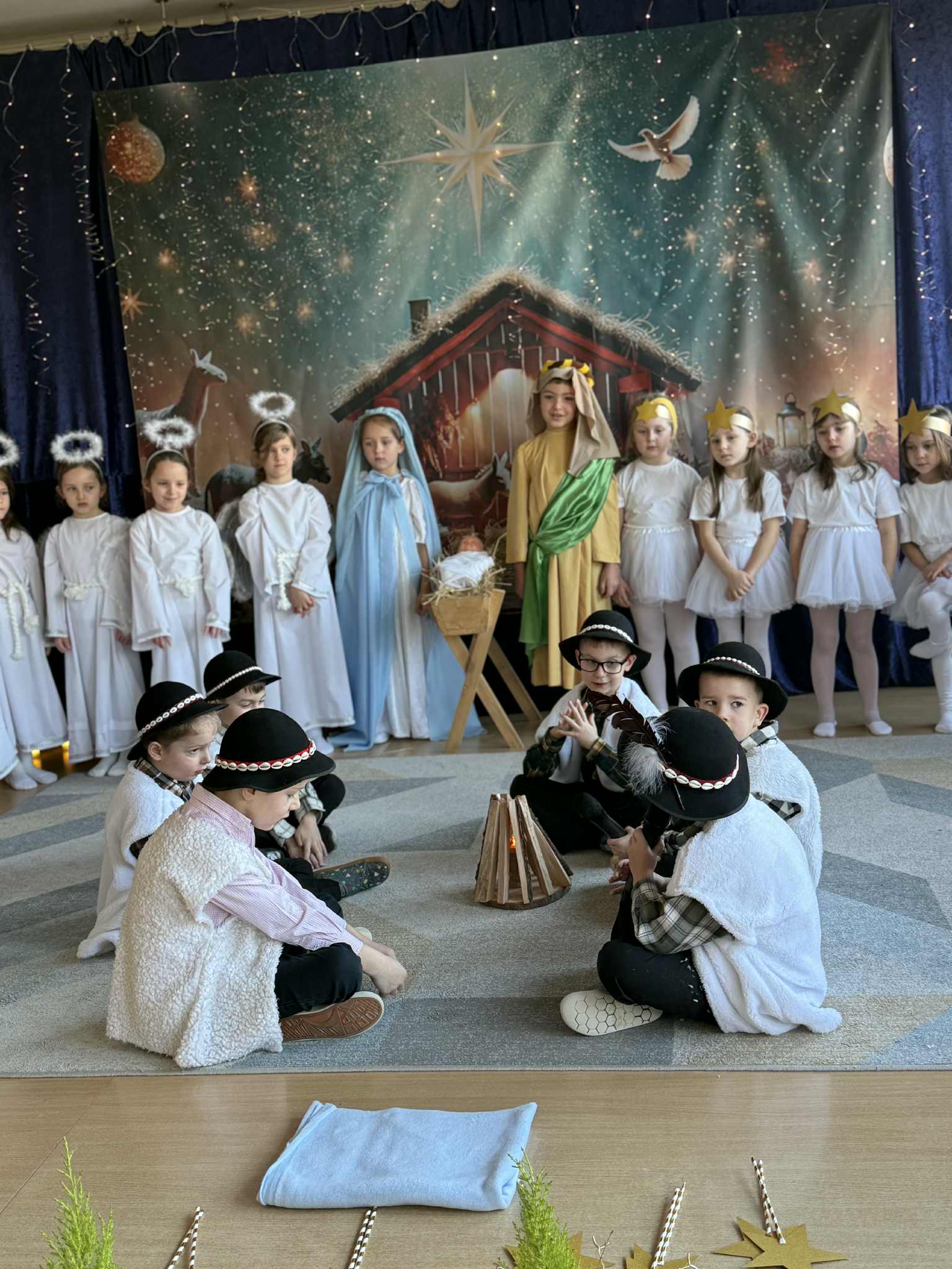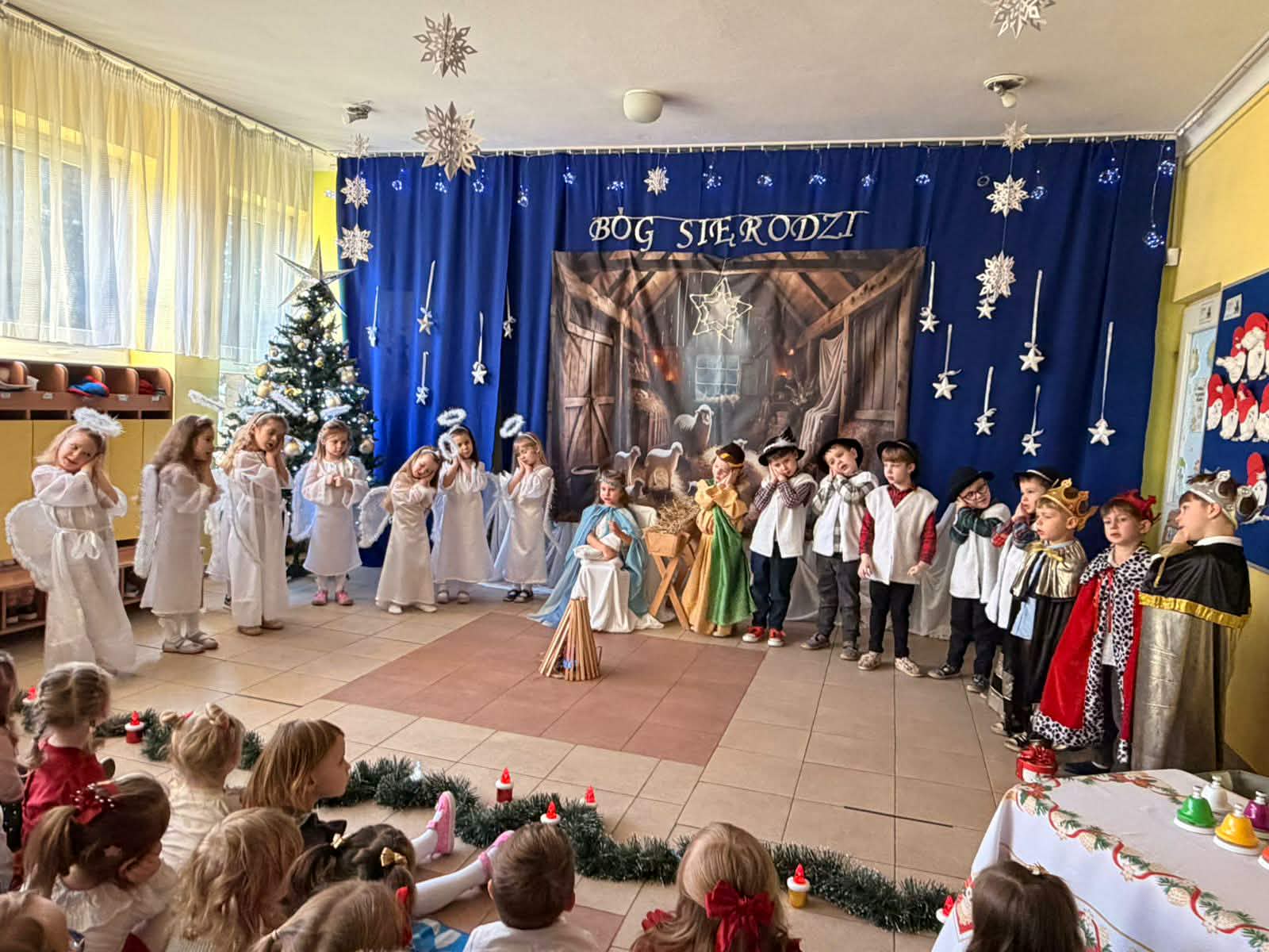 Grupa Pszczółek-5 latków z II budynku oraz grupa Zajączków 6-latków z I budynku wprowadziła społeczność przedszkolną w radosny nastrój oczekiwania na święta Bożego Narodzenia , przedstawiając jasełka ,,Bóg się rodzi". Mali aktorzy z dużym zaangażowaniem wcielili się w swoje role, a radosny śpiew kolęd i pastorałek wprowadził wszystkich w świąteczny nastrój . Po przedstawieniu wszystkie przedszkolaki zasiadły w swoich salach do przedszkolnej wigilii.