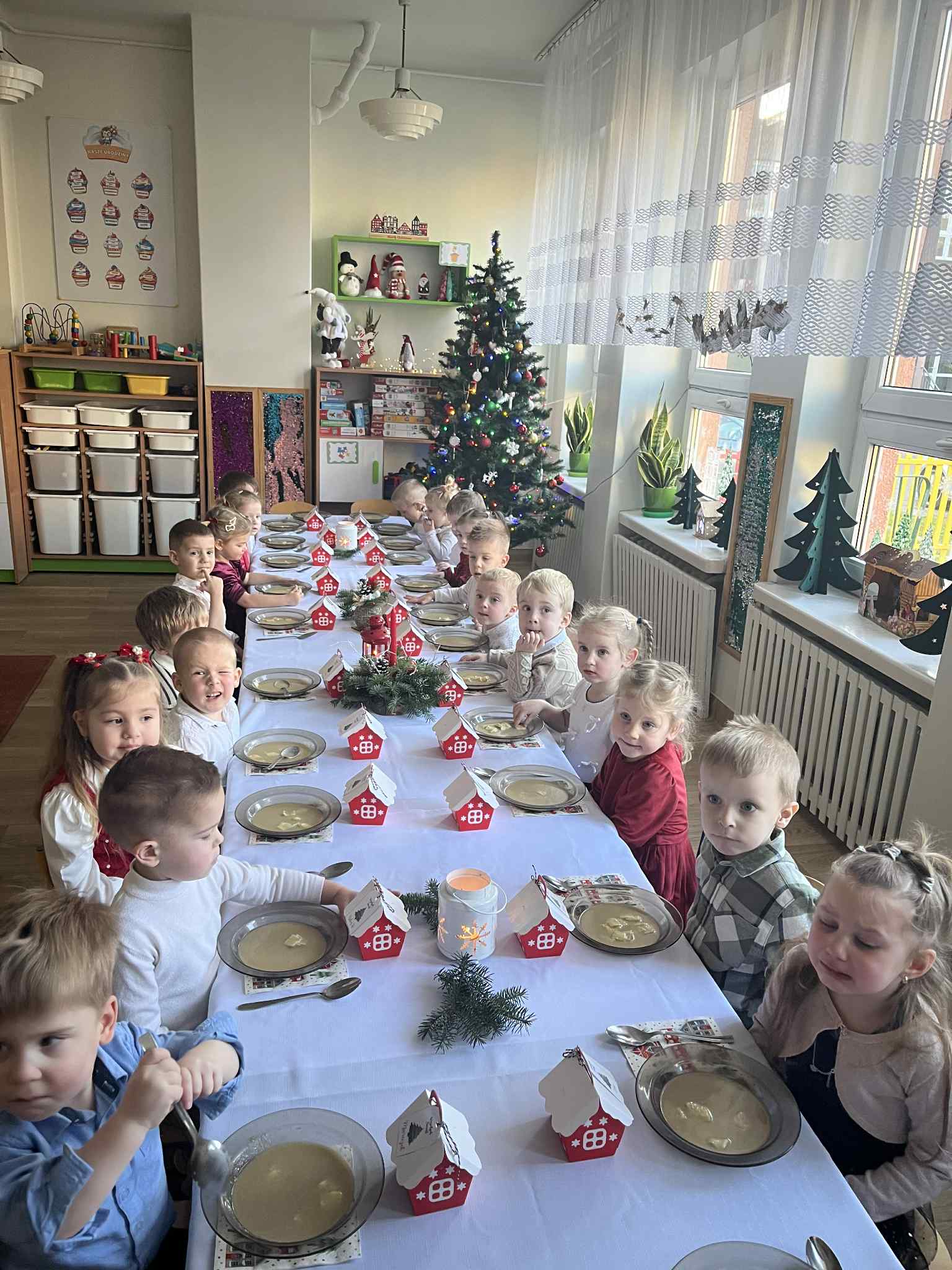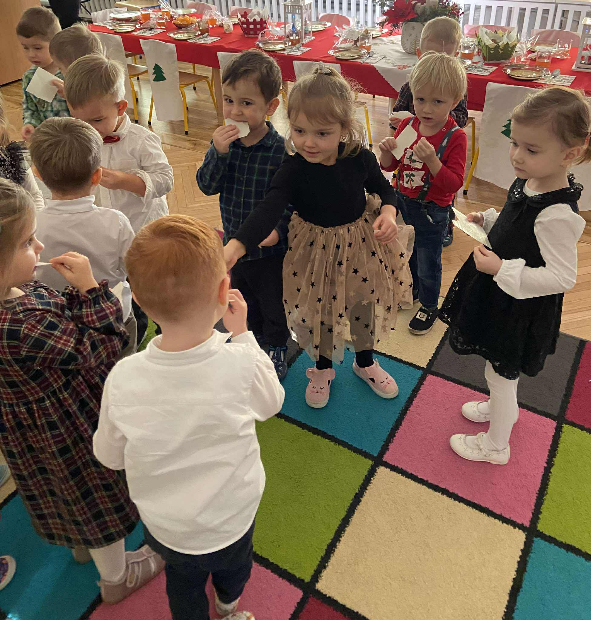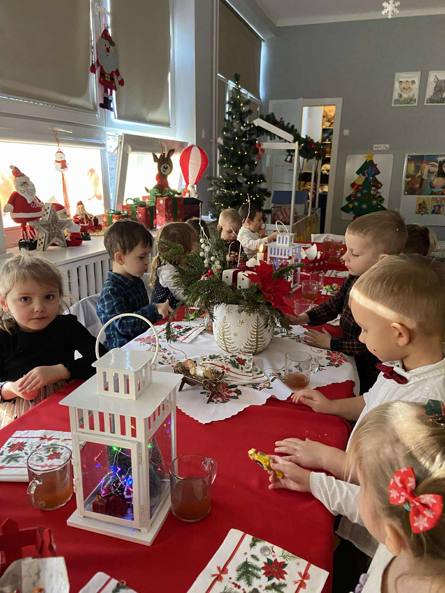 Grupa Pszczółek-5 latków z II budynku oraz grupa Zajączków 6-latków z I budynku wprowadziła społeczność przedszkolną w radosny nastrój oczekiwania na święta Bożego Narodzenia , przedstawiając jasełka ,,Bóg się rodzi". Mali aktorzy z dużym zaangażowaniem wcielili się w swoje role, a radosny śpiew kolęd i pastorałek wprowadził wszystkich w świąteczny nastrój . Po przedstawieniu wszystkie przedszkolaki zasiadły w swoich salach do przedszkolnej wigilii.