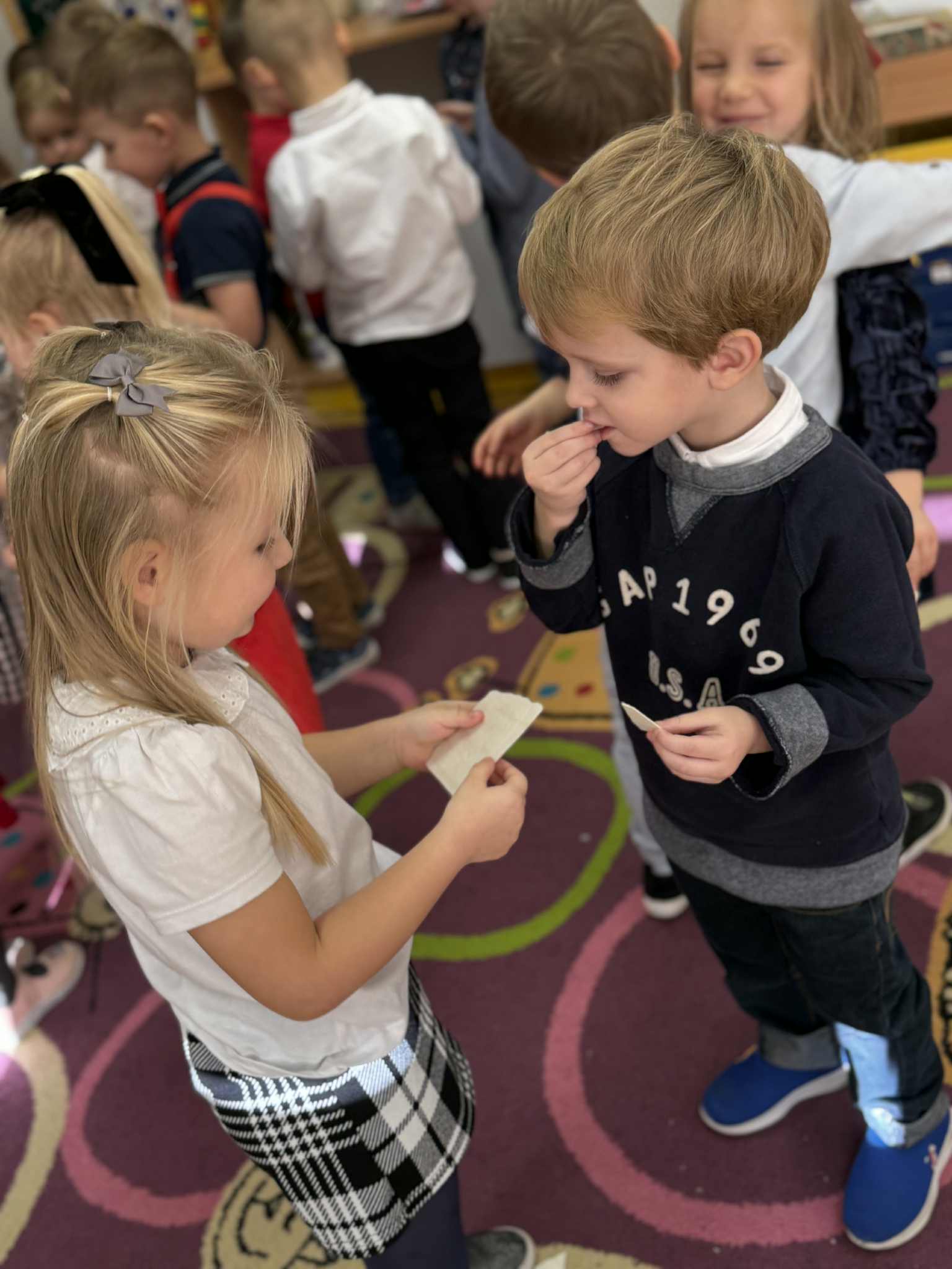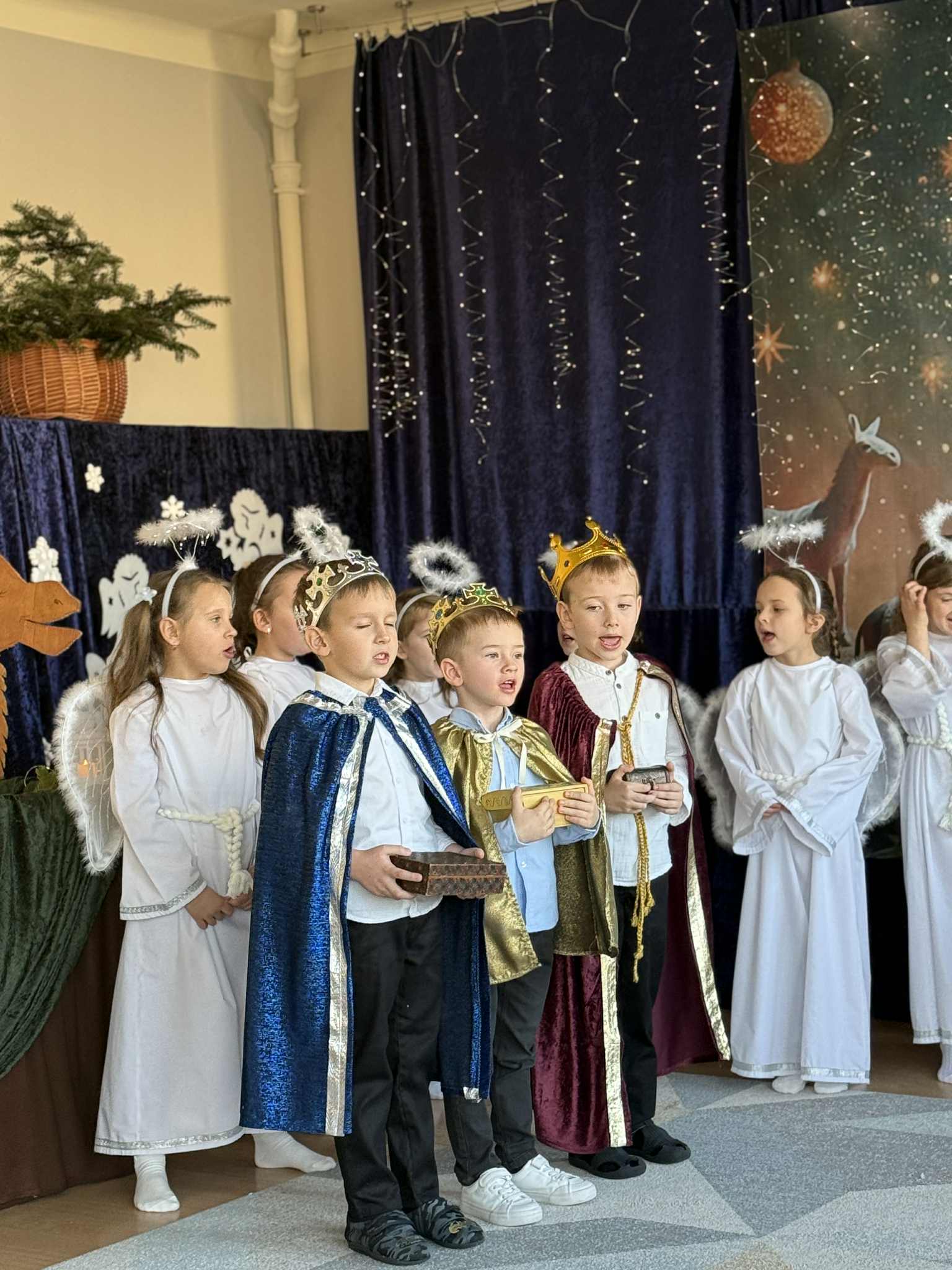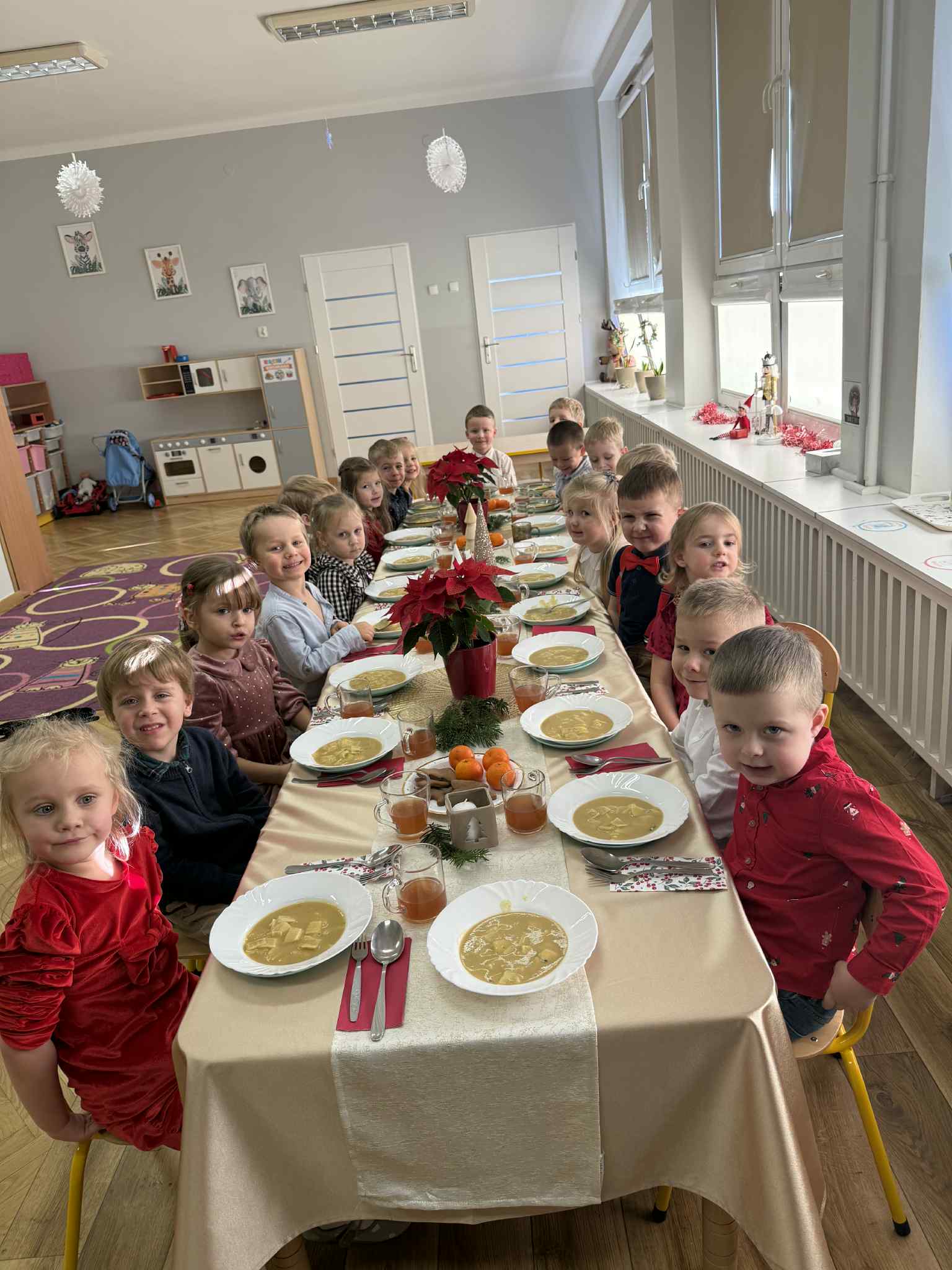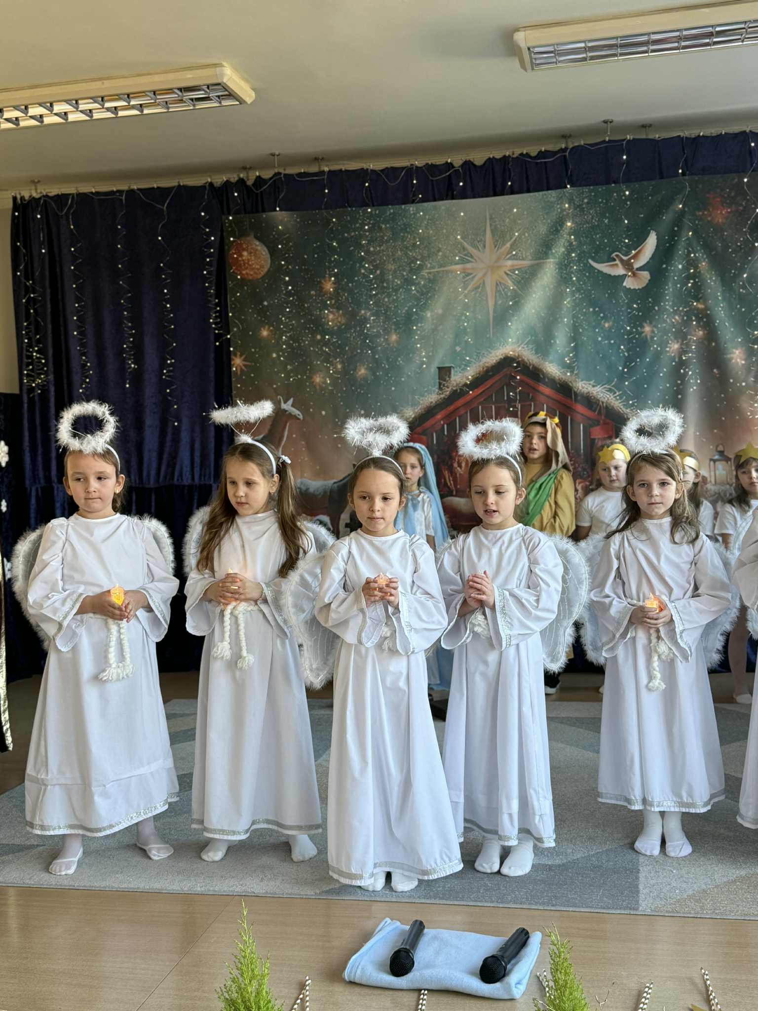 Grupa Pszczółek-5 latków z II budynku oraz grupa Zajączków 6-latków z I budynku wprowadziła społeczność przedszkolną w radosny nastrój oczekiwania na święta Bożego Narodzenia , przedstawiając jasełka ,,Bóg się rodzi". Mali aktorzy z dużym zaangażowaniem wcielili się w swoje role, a radosny śpiew kolęd i pastorałek wprowadził wszystkich w świąteczny nastrój . Po przedstawieniu wszystkie przedszkolaki zasiadły w swoich salach do przedszkolnej wigilii.