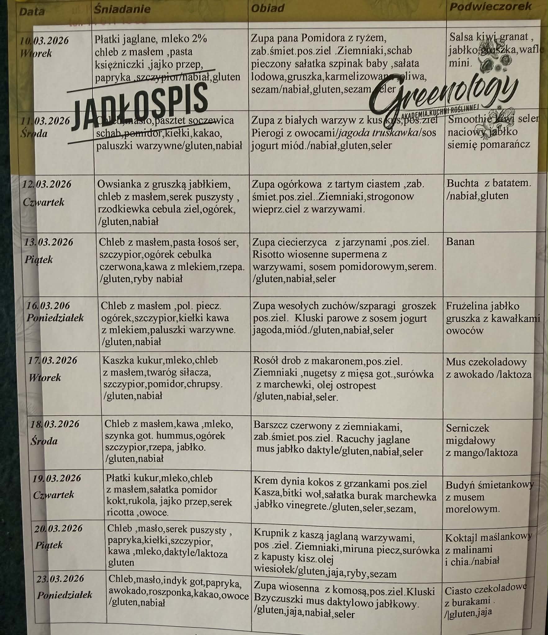 Zgodnie z rozporządzeniem Parlamentu Europejskiego i Rady nr 1169/2011 w sprawie przekazywania konsumentom informacji na temat żywności, które ze szczególnym uwzględnieniem alergenów, muszą być łatwo dostępne tak, aby rodzic miał świadomość, że w odniesieniu do danej żywności występują kwestie związane z alergiami i nietolerancją pokarmową. W związku z powyższym przy jadłospisie znajduje się spis alergenów, a przy potrawach numer alergenów jaki zawiera.